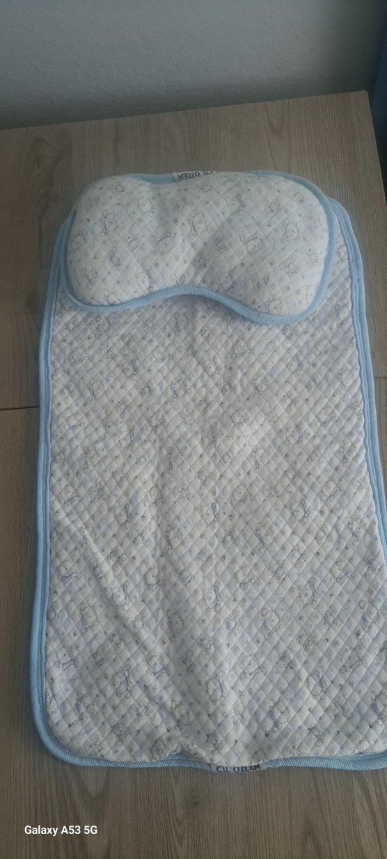 Yumuşak sentetik kumaştan, pastel mavi renkte, kapitone ve desensiz tasarıma sahip bebek yatma minderi ve yastığı. ️
