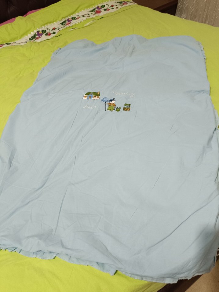 Pastel mavi renkte, yumuşak kumaştan yapılmış çocuk yorganı Ortasında küçük nakış ev desenleri bulunur. Rahatlık ve sıcaklık sağlar. Dış fırfırndan uzunluk 120 genişlik 83 cm dir kullanıldı fakat temiz ürün yırtık sökük yok