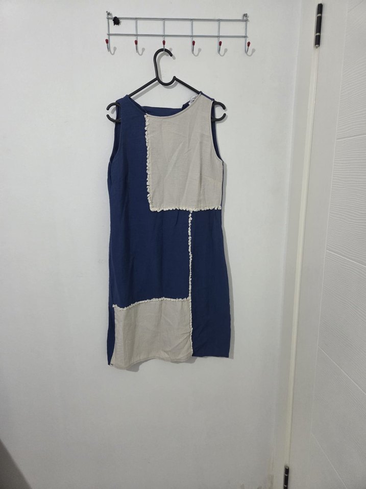 Mavi ve bej renklerde, keten kumaştan, askısız ve bol kesim midi elbise. Minimalist bohem tarzda asimetrik detaylar içerir.
