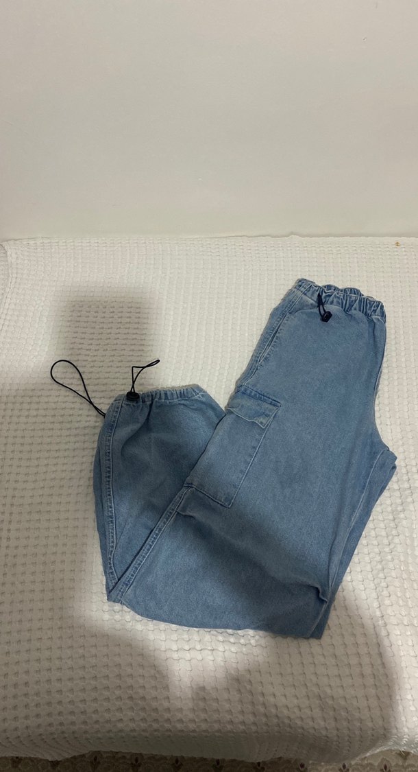 Beli lastikli ve kemerli, rahat kesim mavi denim kadın jean. Günlük kullanım için uygun ve konforlu.