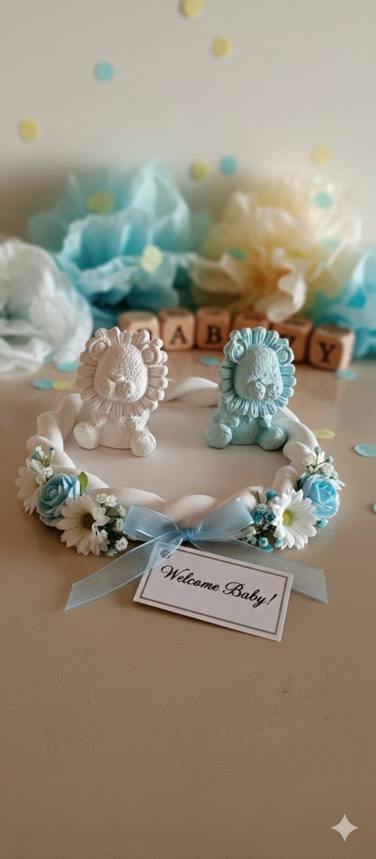 Pastel mavi renkli, iki aslan figürlü taş tozu obje ve tabapı"Welcome Baby" etiketi ve çiçek detayları içerir. hastanede odasında harika bir dekor