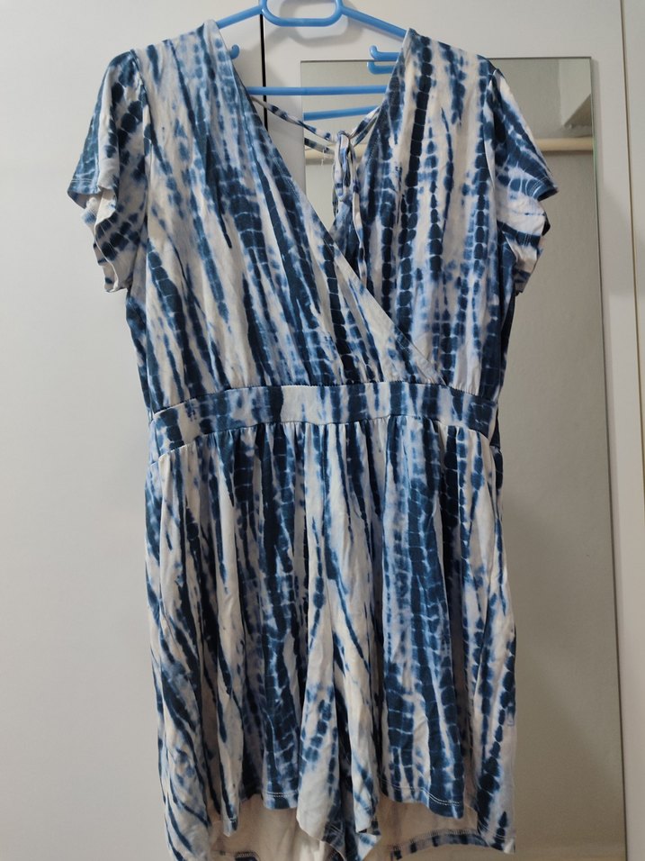 Bohem tarzda, mavi ve gri bağlama desenli, kısa kollu, V yakalı, pileli şort tulum . Rahat kesimi ve yumuşak sentetik kumaşıyla günlük kullanım için uygun. 46-48-50 beden uyumlu esnek kumaşlı 90-100 kg arası rahatla kullanabilir