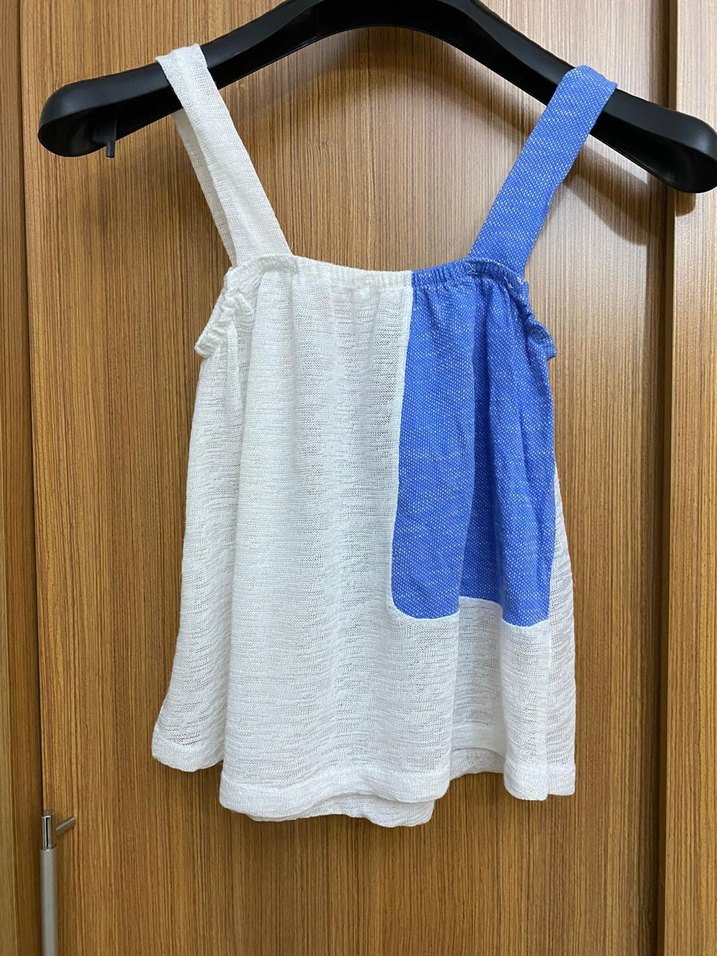 Geniş askılı, hafif mavi ve beyaz bağlamalı desenli kız çocuk atleti. Yumuşak ve nefes alan kumaştan üretilmiştir.
