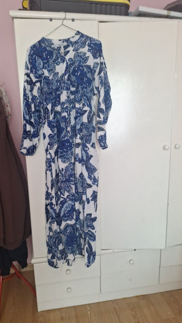 Mavi beyaz tie-dye desenli, uzun kollu, V yaka, bol kesim bohem uzun elbise. Sentetik kumaştan, günlük kullanıma uygun drapeli tasarım.