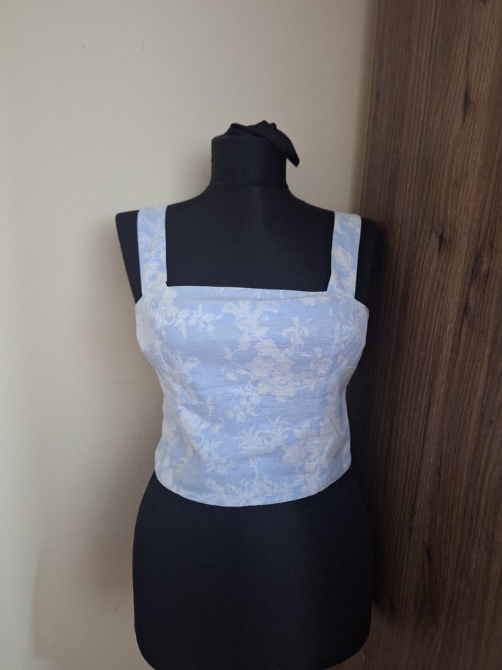 Pastel mavi ve beyaz çiçek desenli, sentetik kumaştan kısa ve regular fit bustiyer. Günlük sokak stili için uygundur.