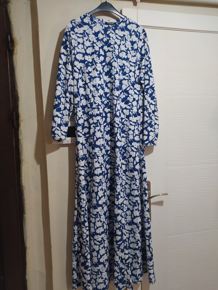 Mavi beyaz çiçek desenli, uzun ve bol kesim pamuklu elbise. Yuvarlak yaka ve uzun kolludur, pileli tasarımıyla bohem tarzı sunar.
