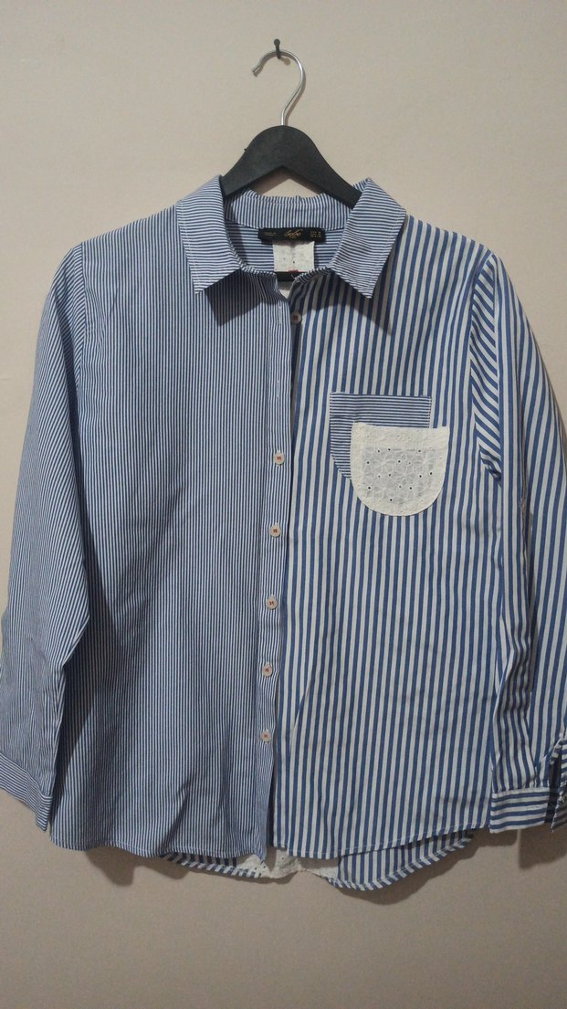 mavi beyaz ister kısa kol ister uzun kol olarak kullanılabilir gömlek dantel cep ve dantel arka pile detayları mevcuttur