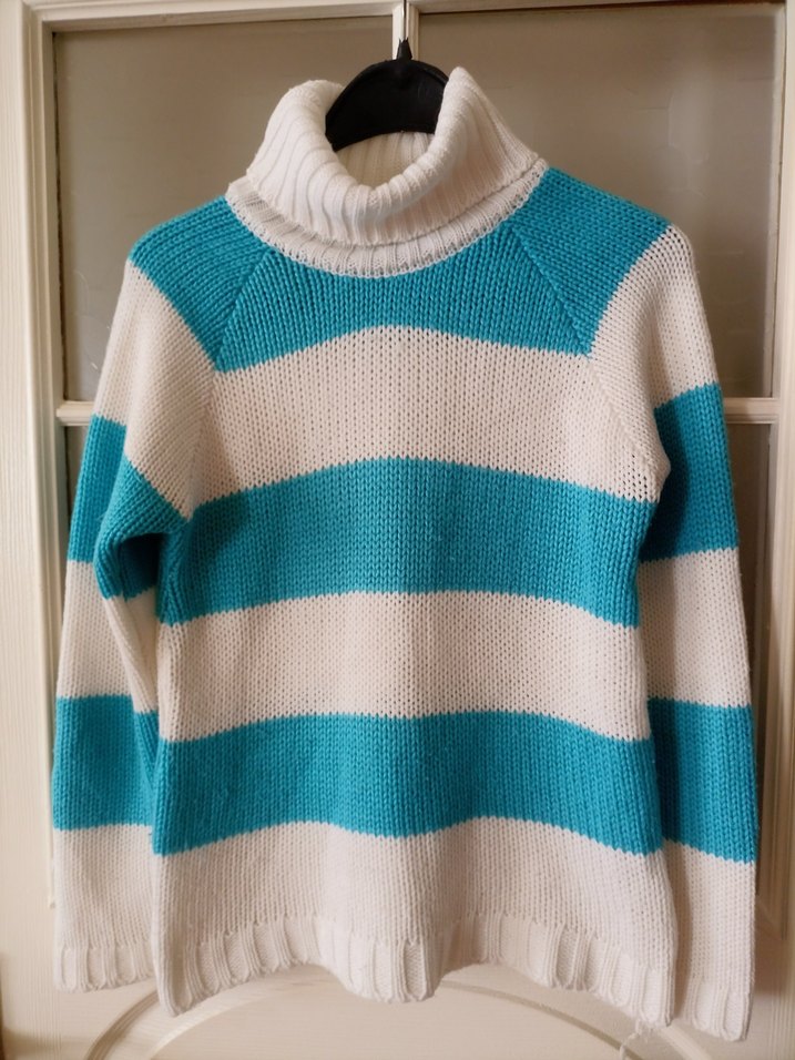 Boğazlı ve uzun kollu, örgü kumaştan yapılmış bu kazak, mavi beyaz pastel çizgilerle rahat ve gündelik bir stil sunar.