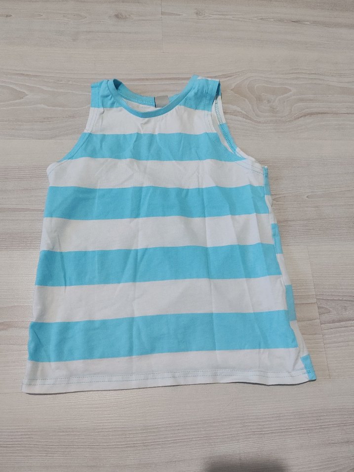 Pastel mavi ve beyaz çizgili, yumuşak kumaştan yapılmış çocuklar için kolsuz atlet.