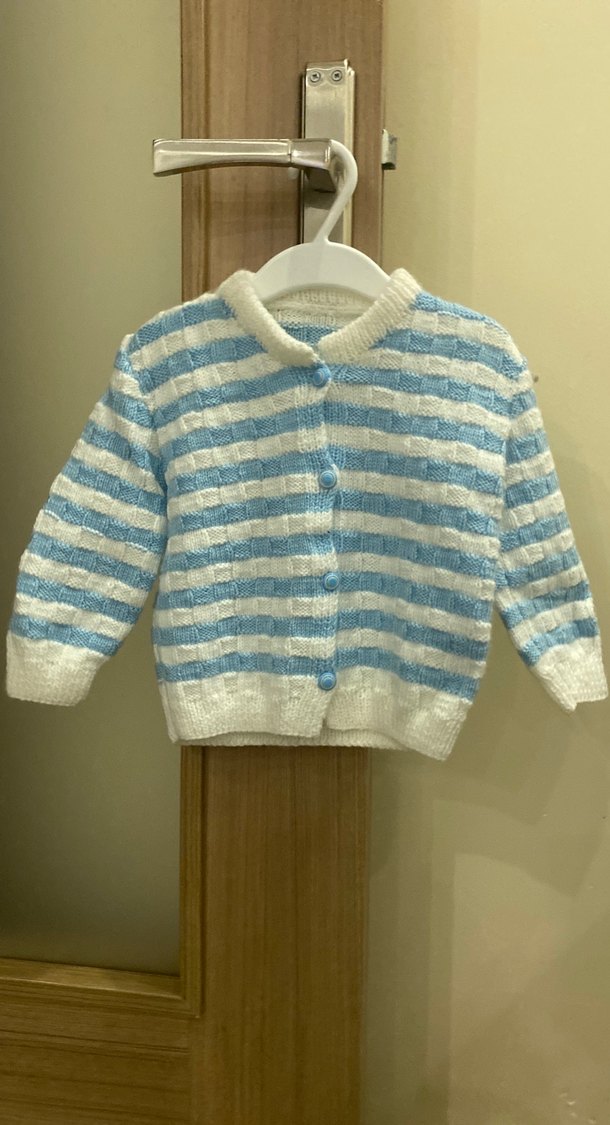 Örgü dokulu, uzun kollu ve normal kesim erkek çocuk hırkası. Pastel mavi ve beyaz çizgili desene sahiptir, düğmeler mavi renkte.