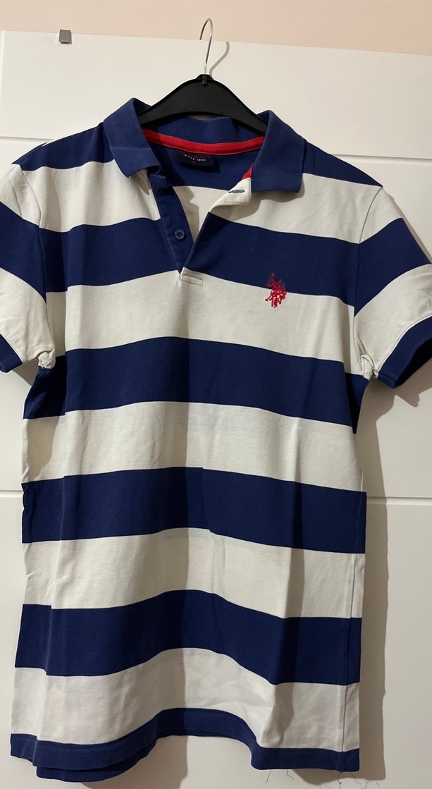 Kısa kollu, yakalı erkek polo tişört, pamuklu kumaştan, mavi beyaz çizgili ve düğmeli. Günlük rahat kullanıma uygun, dar kesim.