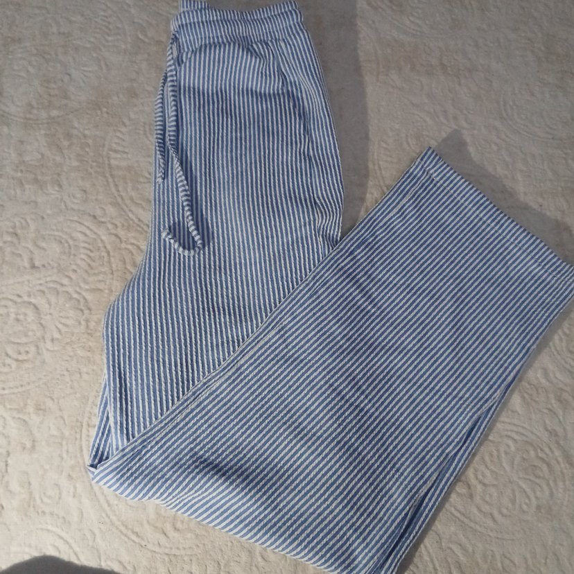 Mavi Beyaz Çizgili Kadın Keten Pantolon