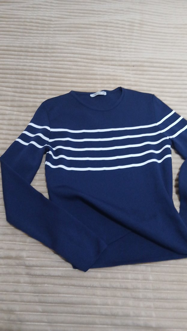 Mavi renkli, beyaz çizgili, yuvarlak yaka ve uzun kollu, vücuda oturan örgü kadın kazak. Günlük kullanıma uygundur.
