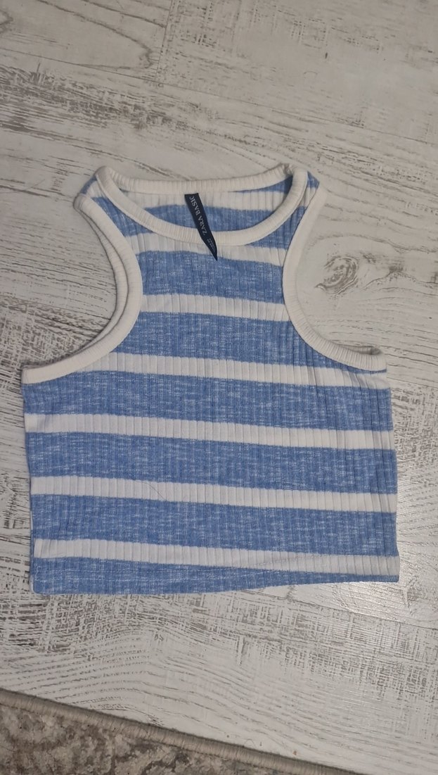 Mavi beyaz çizgili, kısa ve dar kesim crop. Halter yakalıdır.