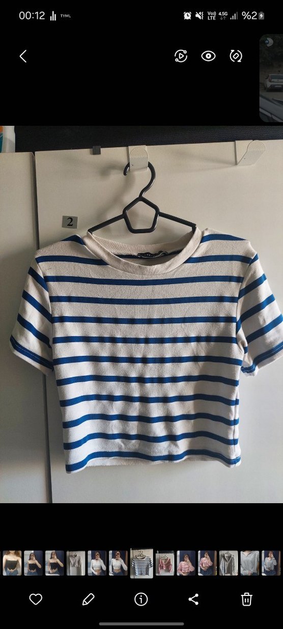 Pamuk kumaştan, kısa kollu ve bisiklet yaka mavi beyaz çizgili, günlük kullanıma uygun, rahat kesim kadın tişörtü.