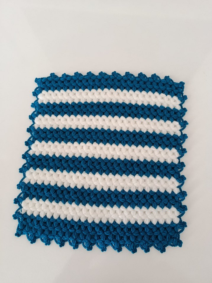 Mavi ve beyaz çizgili, el örgüsü dokulu, yumuşak ve dokulu banyo lifi. İsteğe göre sipariş alınır(renk)