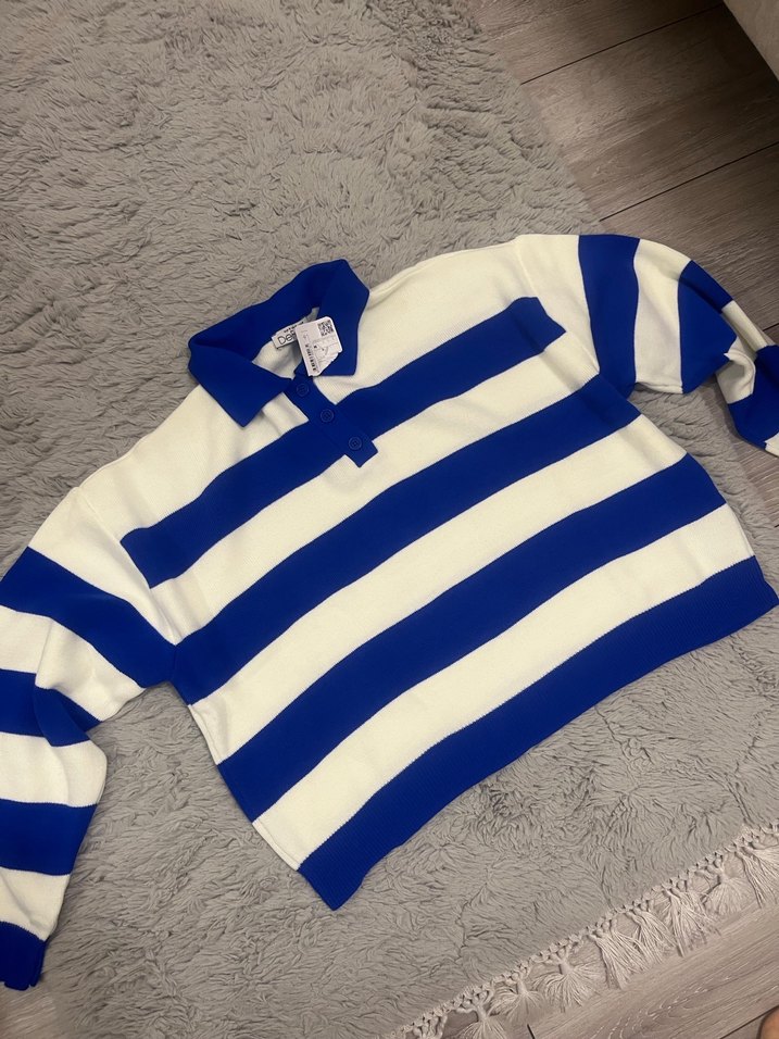 Kadınlar için mavi beyaz çizgili, örgü dokulu, uzun kollu ve yakalı kazak. Pamuklu, rahat ve günlük kullanıma uygun. Etiketli ürün iade sürem geçtiği için iade edemedim marka defacto