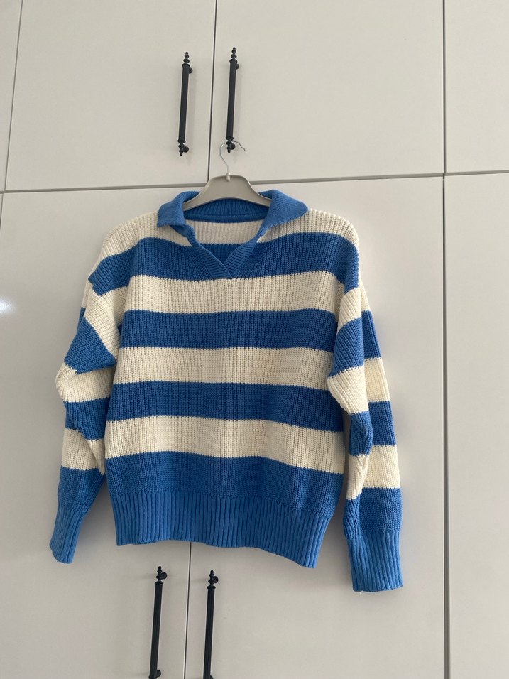 Örgü kumaştan, uzun kollu ve yakalı bu rahat kadın kazak, gevşek kesimi ve mavi-beyaz çizgileriyle gündelik sokak stiline uygundur.