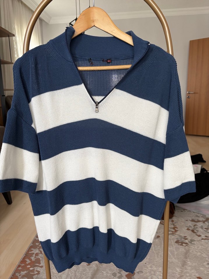 Mavi Beyaz Çizgili Pamuklu Erkek Kısa Kollu Triko