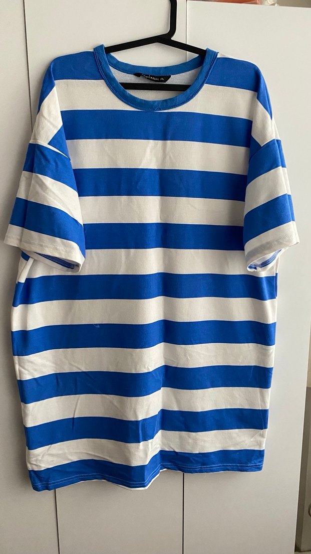 Mavi ve beyaz çizgili, kısa kollu, bol kesim hamile tişörtü. Pamuk kumaştan, günlük rahat kullanım için uygun. 1 defa kullanıldı Büyük bedenler için uygun baya geniş çünkü kalıbı
