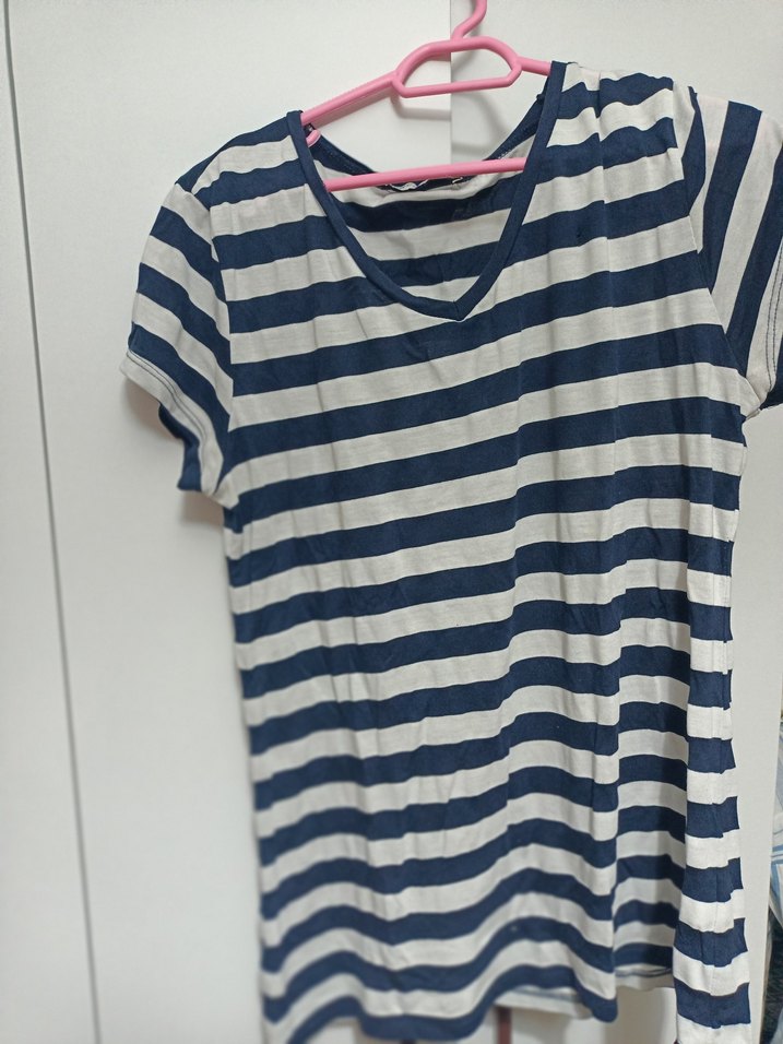 Mavi beyaz çizgili pamuklu tişört, V yaka ve kısa kolludur. Rahat kesimi ve günlük sokak stiliyle konfor sunar.
