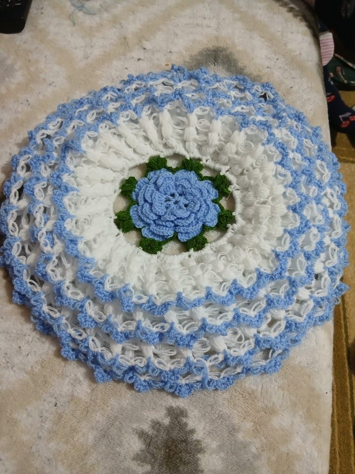 Mavi ve beyaz renklerde çiçek detaylı el örgüsü lif
