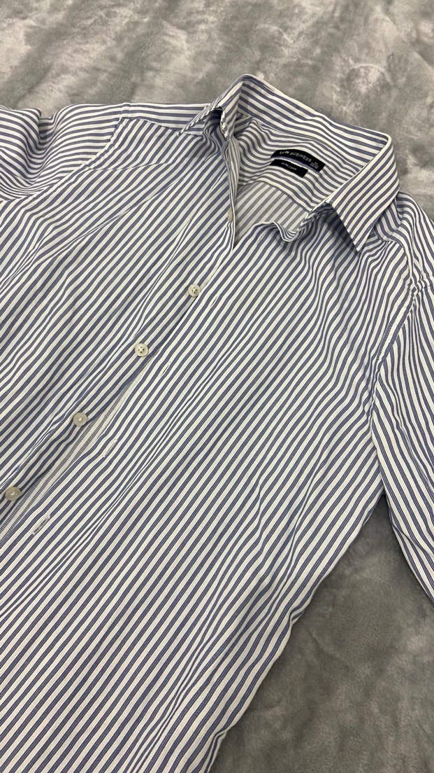 Mavi ve gri çizgili, kısa kollu, düğmeli ve yakalı pamuklu erkek gömleği. Normal kesim ve midi boyda, ofis ve günlük sokak stili için uygundur.