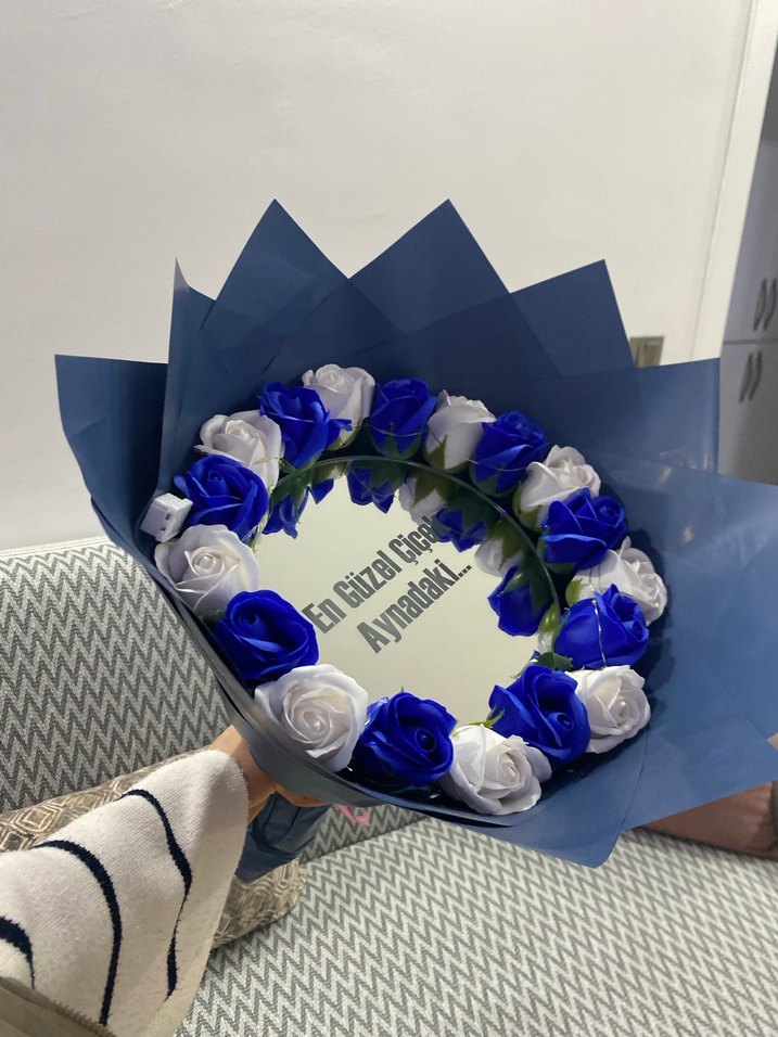 Mavi ve beyaz güllerden oluşan, ortasında "en guzel çiçek aynadaki" yazısı bulunan cıcek buketı