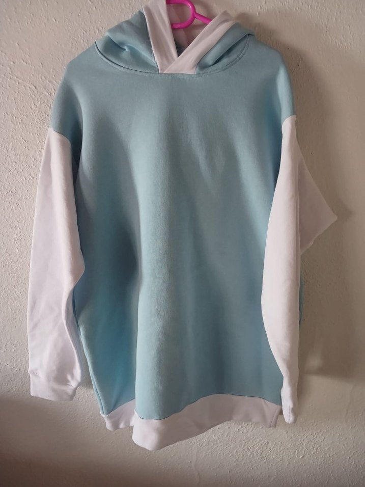 Yumuşak kumaştan, mavi gövde ve beyaz kollu, kapüşonlu, bol kesim kadın sweatshirt. Günlük kullanıma uygun rahat ve şık tasarım. sıfır boyu 72cm eni 55cm