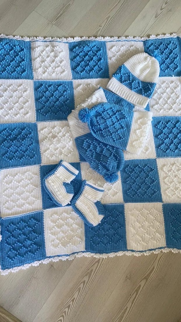 Renkli mavi beyaz kareli örgü bebek battaniyesi, uyumlu bere ve patiklerle tamamlanmıştır.