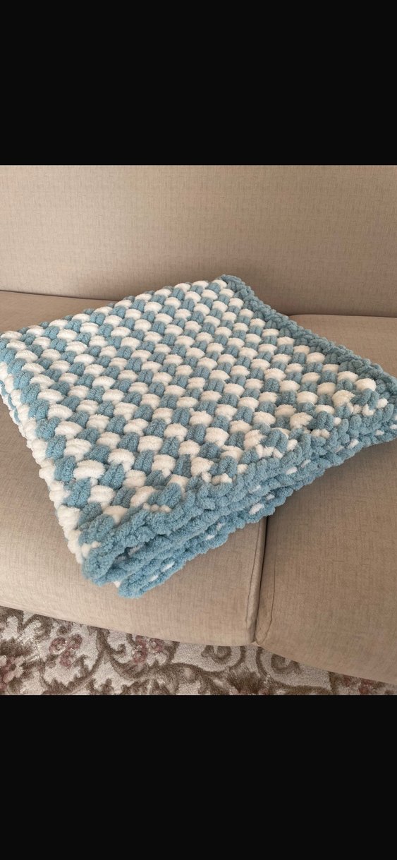 Mavi ve beyaz kareli desenli, yumuşak ve rahat örgü çocuk battaniyesi.