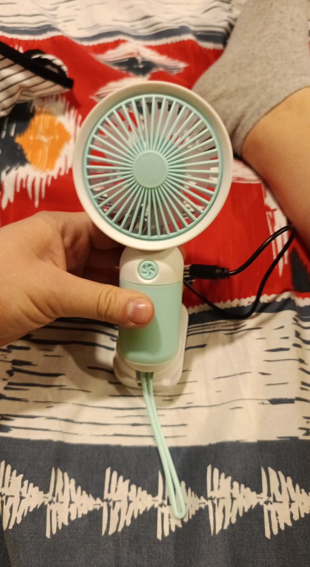 Mavi ve beyaz renklerde, düğmeli küçük masaüstü vantilatör. Kompakt ve taşınabilir, kişisel kullanım için uygundur. ️