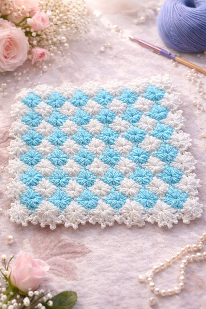 Pastel mavi ve beyaz renklerde, yumuşak dokulu örgü banyo lifi El örgüsü