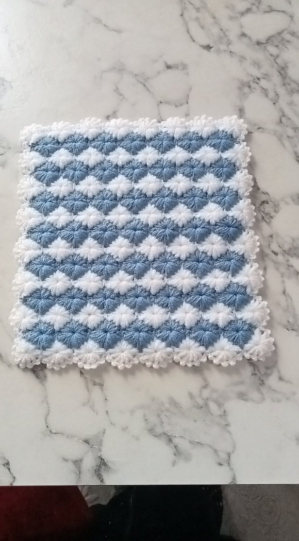 Mavi ve beyaz renklerde, dokulu desenli örgü banyo lifi.
