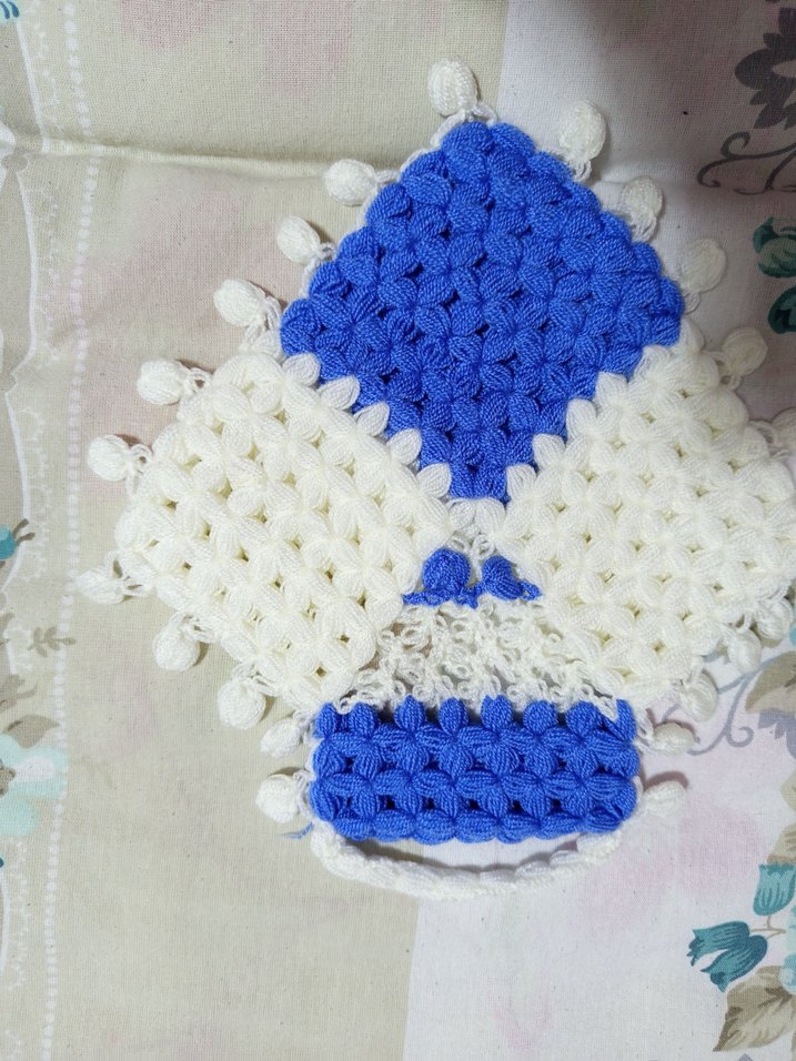 Mavi ve beyaz renklerde, dokulu örgü tasarıma sahip renkli banyo süngeri.
