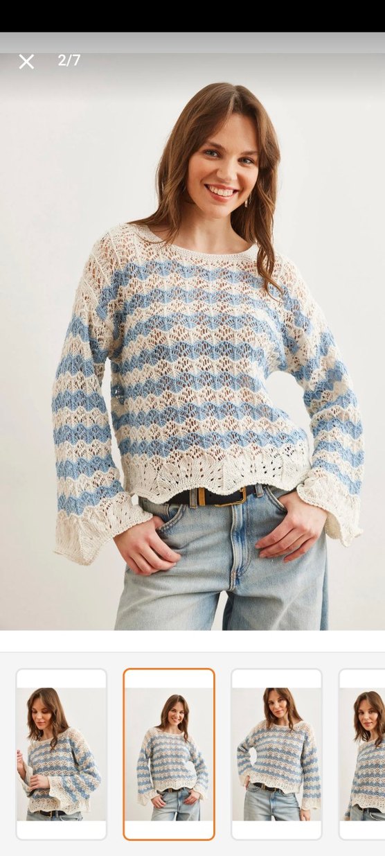 Hiç giymedim. Standart beden. Bu kadın kazak, bol kesim ve uzun kollu olup bisiklet yaka tasarıma sahiptir. Yumuşak örgü kumaştan yapılmış, pastel mavi-beyaz batik desenli bohem tarzda, günlük kullanım için uygundur.