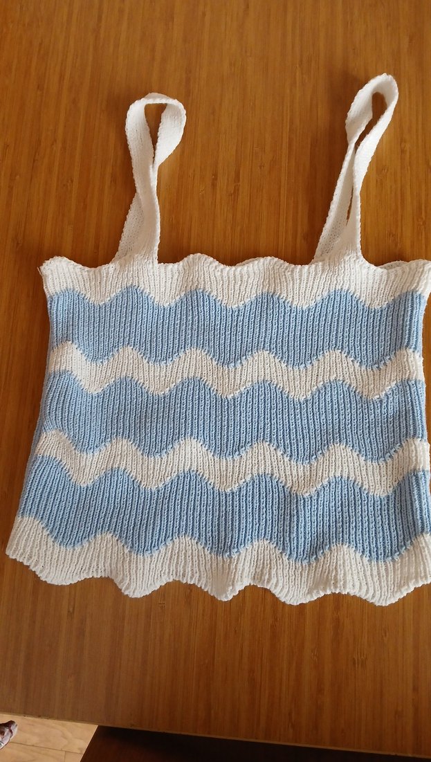 Kadınlar için pastel mavi ve beyaz renklerde örgü dokulu bohem tarzda plaj crop. Yumuşak ve rahat örme kumaştan, günlük kullanım için uygundur.