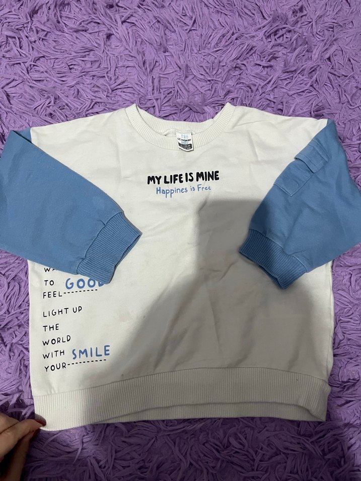 uzun mavi kollu, beyaz ön yüzünde pozitif yazılar bulunan pamuklu sweatshirt. Rahat kalıp ve yuvarlak yaka ile günlük kullanıma uygun.