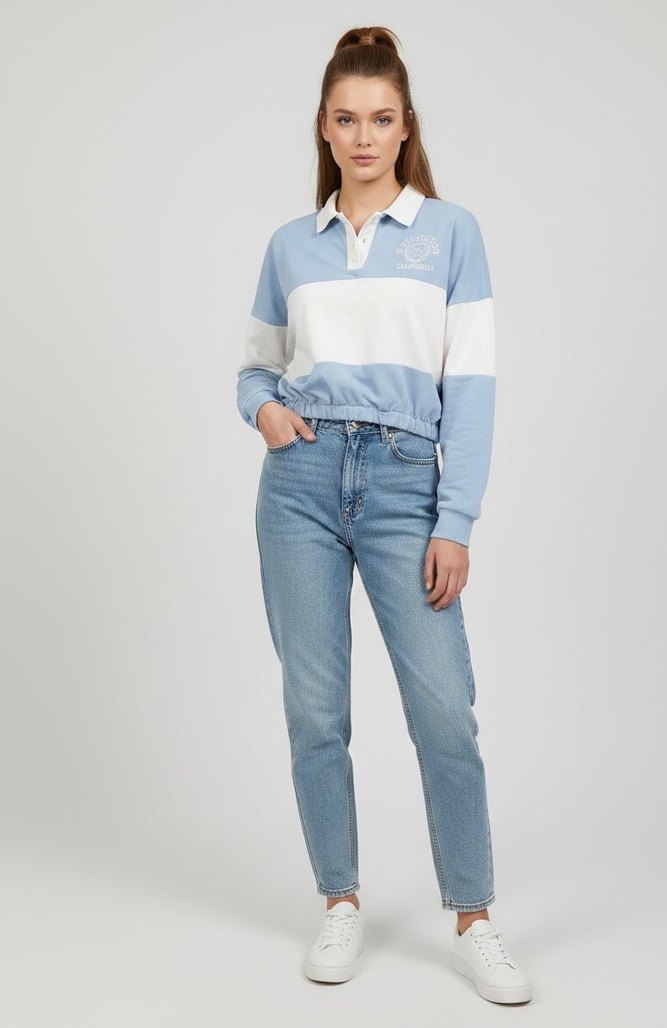 Mavi beyaz pamuklu sweatshirt, düğmeli önü, uzun kollu ve yakalıdır. Elastik bel ile rahat ve salaş bir kesime sahiptir. Günlük spor şıklık için uygundur.