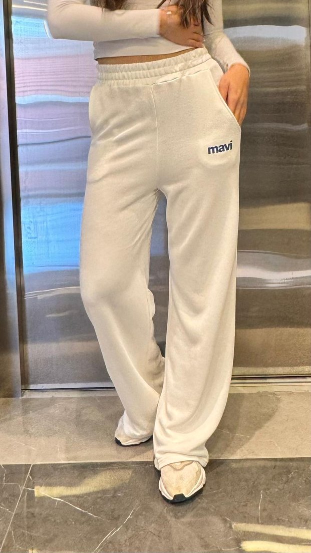 Yumuşak ve sıcak dokulu, bol kesim beyaz eşofman altı. Mavi logosu ile günlük kullanım için rahat ve şık bir tercih. ♀️