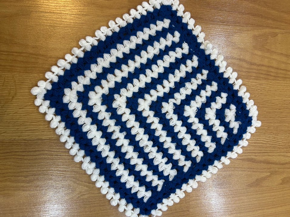 Mavi ve beyaz renklerde örülmüş, yumuşak dokulu renkli banyo lifi.