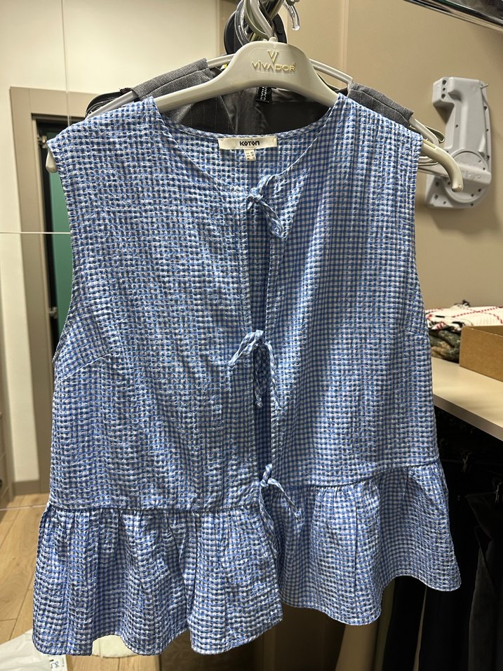Mavi ve beyaz tonlarda tie-dye desenli, salaş kesim, fırfırlı etek ucu ve halter yakalı kolsuz kadın bluz, 40 beden yazıyor ama 36/38 ile uyumludur