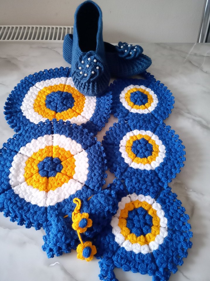 Mavi, beyaz ve sarı renklerde nazar boncuğu motifli el örgüsü set, terlik ve dekoratif parçalar içerir. Yumuşak ve geleneksel tasarım.