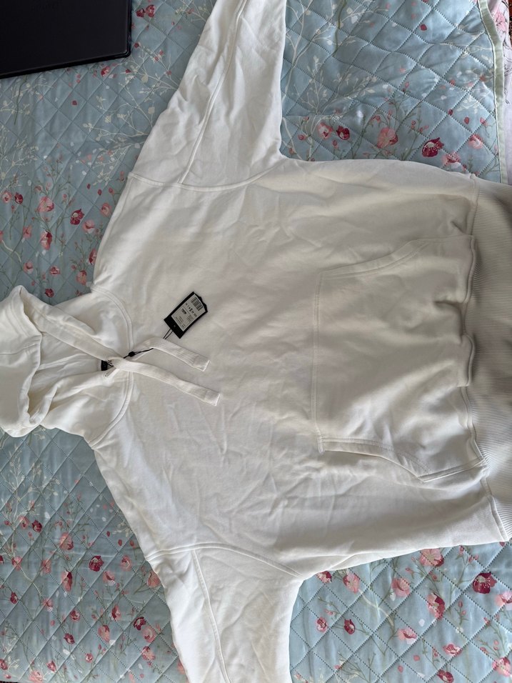Pamuklu beyaz kapüşonlu sweatshirt, uzun kollu ve bol kesimdir. Düğmeli detayı ve midi boyu ile günlük rahat şıklık sunar.