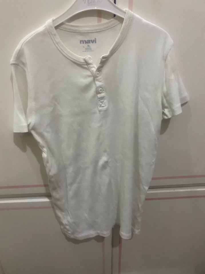 Mavi markasına ait beyaz, düğmeli yakalı ve desensiz pamuklu