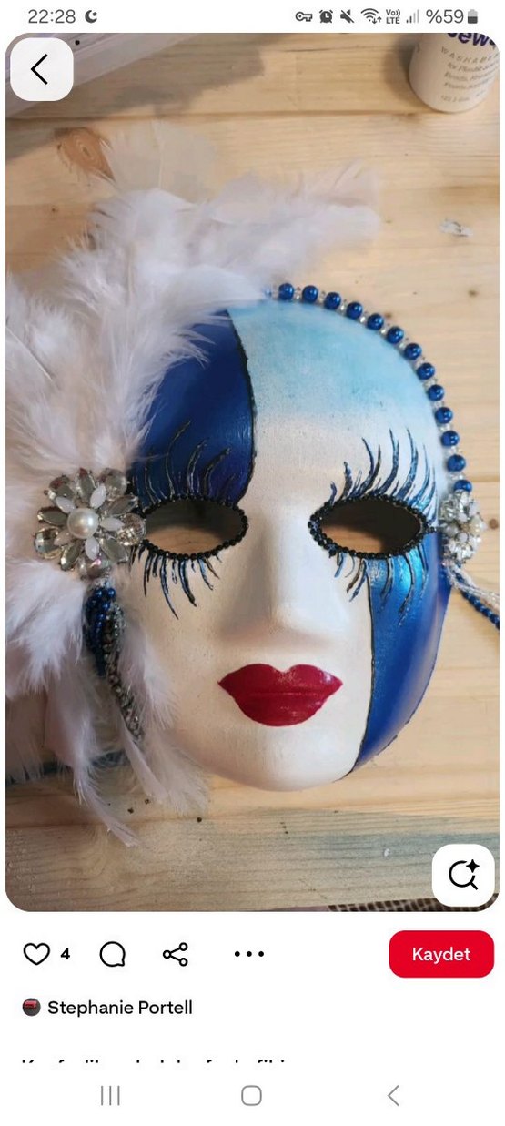 Mavi ve beyaz renklerde, boncuk ve tüy süslemeli kadın maskesi. Göz çevresinde çiçek detayları ve kırmızı dudak çizimi bulunur.