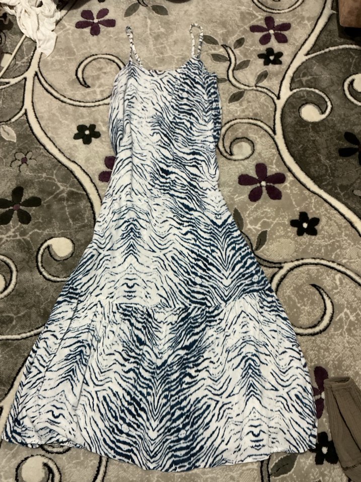 Mavi beyaz zebra desenli, ince askılı ve kayık yaka uzun elbise. Yumuşak sentetik kumaştan, kürk detaylı, bohem tarzda, dış mekan için uygun.