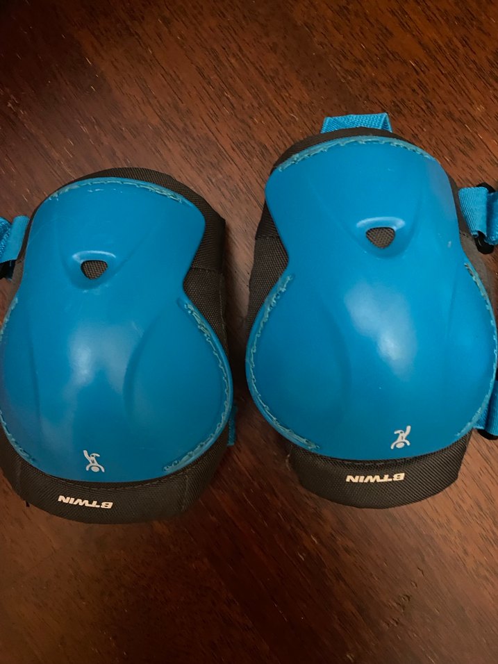Mavi renkli, kauçuk dış yüzeye sahip biker tarzı diz koruyucular, rahat kullanım için Velcro bantlarla donatılmıştır. Üzerinde "NIMULE" markası bulunur. ️