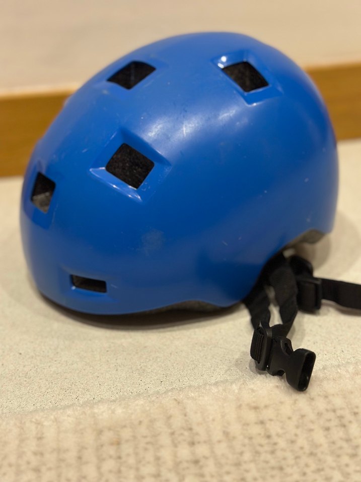 Koyu mavi renkte, plastikten yapılmış ve havalandırma deliklerine sahip biker kask. Velcro bantlı ve ayarlanabilir.
