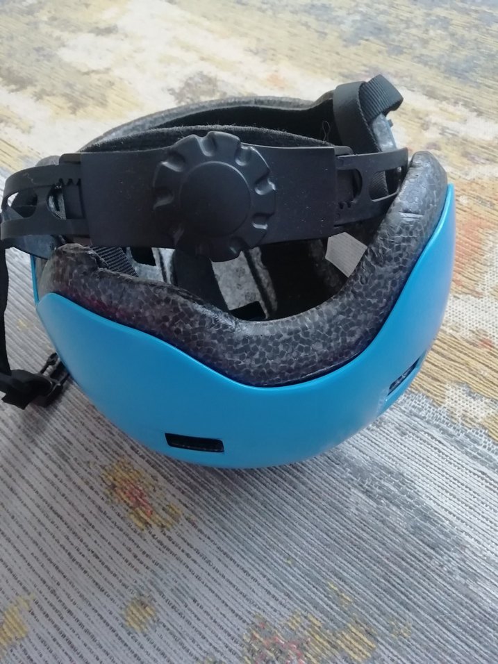Koyu mavi renkte, plastik malzemeden yapılmış biker motosiklet kaskı. Velcro bantlı, desen içermeyen, rock punk tarzına uygun.